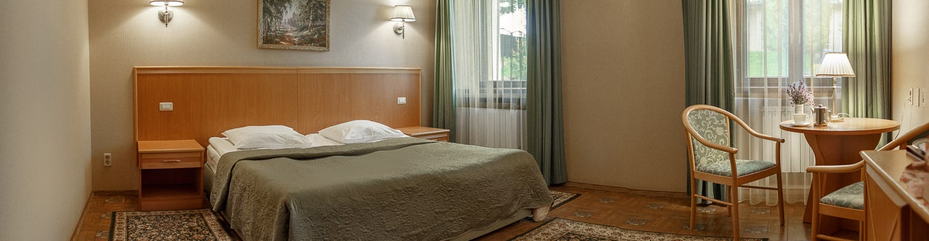 Номера оформлены в классическом стиле. Просторные, светлые, стильные номера. В номере 1 двухспальная кровать или 2 полуторные бокс-кровати (совмещаются).